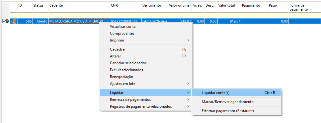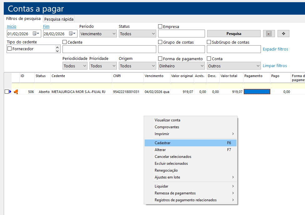 - Para iniciar um novo cadastro de Contas a Pagar podemos clicar com o Botão Direito do mouse > Cadastrar ou pressionar o atalho F6 no teclado.