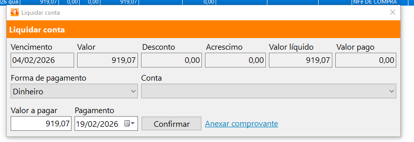 Selecione o tipo de pagamento, conta cadastrada e confirme a liquidação.